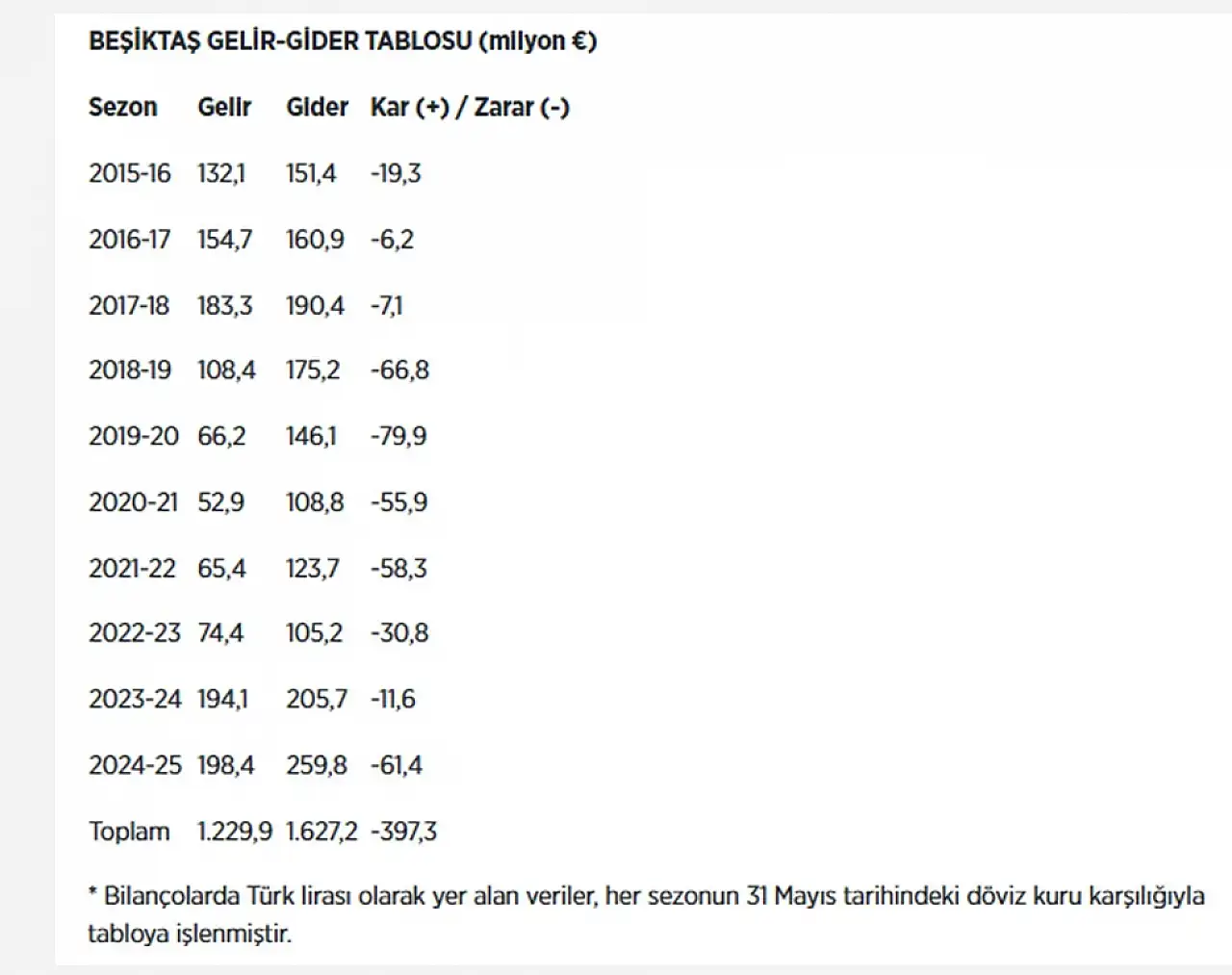 Beşiktaş, Fenerbahçe'den sonra en fazla zarar eden kulüp konumunda bulunuyor. Geride kalan 10 sezonun hiçbirinde denk bütçeyi tutturamayan siyah-beyazlı kulüp 397 milyon avro zarara uğradı.