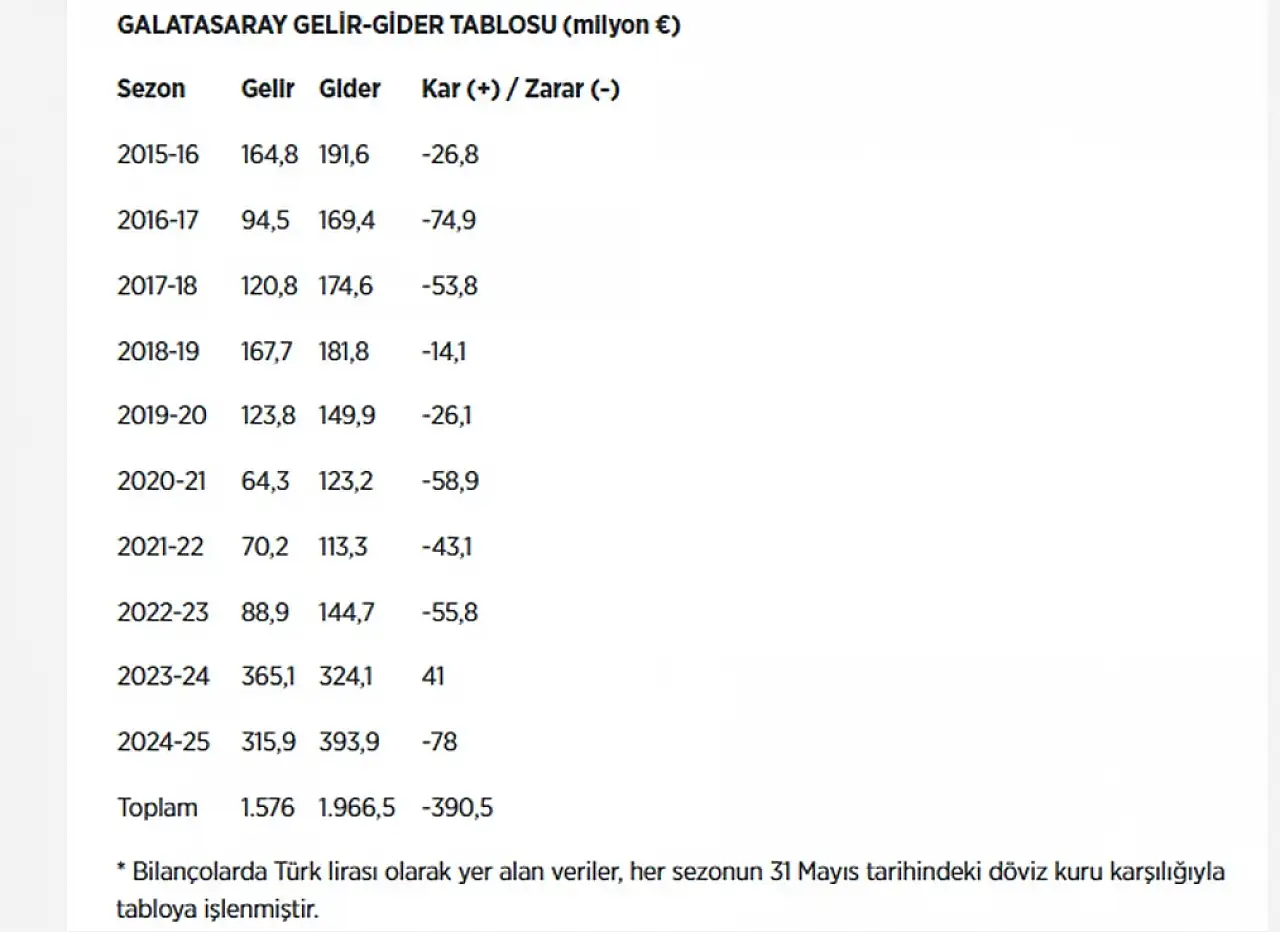 Galatasaray 2023-24 sezonunda 41 milyon avroluk kâra ulaşsa da diğer 9 sezonda zarara uğramaktan kurtulamadı. Gelirlerinin toplamı 1 milyar 576 milyon avro, gider toplamı ise 1 milyar 966 milyon avro olarak gerçekleşti.