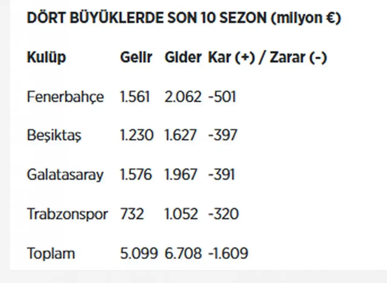 4 büyük takımların güncel borçları belli oldu. Kamuyu Aydınlatma Platformuna (KAP) gönderilen finansal durum ve bağımsız denetçi raporlarına göre, 4 büyük takım olan Beşiktaş, Fenerbahçe, Galatasaray ve Trabzonspor’un son 10 yılda toplamda 1 milyar 609 milyon avro zarar ettiği belirtildi.