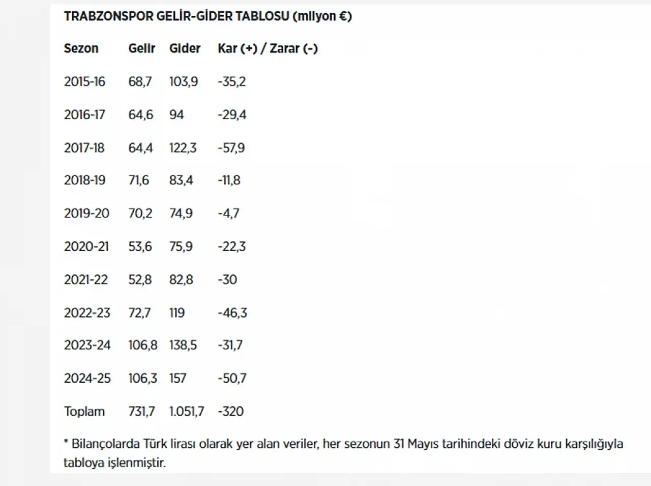 Trabzonspor da Beşiktaş gibi sezonların hiçbirinde gelir-gider dengesini sağlayamadı. Bordo-mavili kulüp, 732 milyon avroluk gelirine karşın 1 milyar 52 milyon avro harcadı ve toplamda 320 milyon avroluk açık verdi.