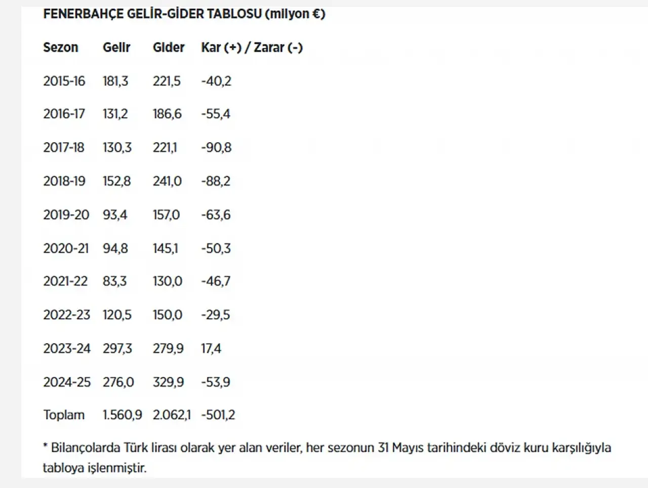 Fenerbahçe sadece 1 sezon kâr elde etti ve 2023-24 sezonunda giderlerinden 17,4 milyon avro daha fazla gelire ulaştı. Diğer 9 sezonda zarara engel olamayan sarı-lacivertli kulüp, toplam 1 milyar 561 milyon avroluk gelir elde ederken kasasından 2 milyar 62 milyon avro çıktı.