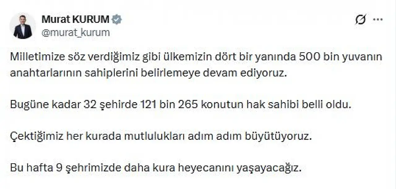 Çevre, Şehircilik ve İklim Değişikliği Bakanı Murat Kurum, sanal medya hesabından 26-31 Ocak haftasına ilişkin kura takvimini paylaştı. Kurum paylaşımında, "Milletimize söz verdiğimiz gibi ülkemizin dört bir yanında 500 bin yuvanın anahtarlarının sahiplerini belirlemeye devam ediyoruz. Bugüne kadar 32 şehirde 121 bin 265 konutun hak sahibi belli oldu. Çektiğimiz her kurada mutlulukları adım adım büyütüyoruz. Bu hafta 9 şehrimizde daha kura heyecanını yaşayacağız" ifadelerini kullandı.