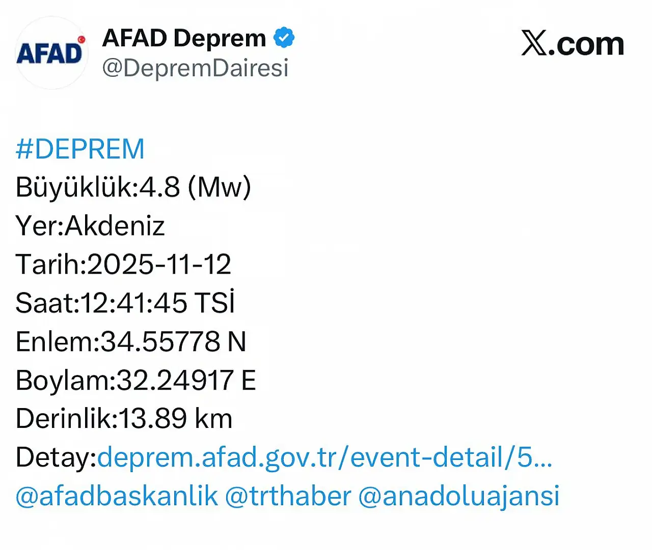 Saat 12: 41'de Akdeniz açıklarında 4.8 şiddetinde bir deprem daha kaydedildi. Depremin derinliği ise 13. 89 km olarak ölçüldü.