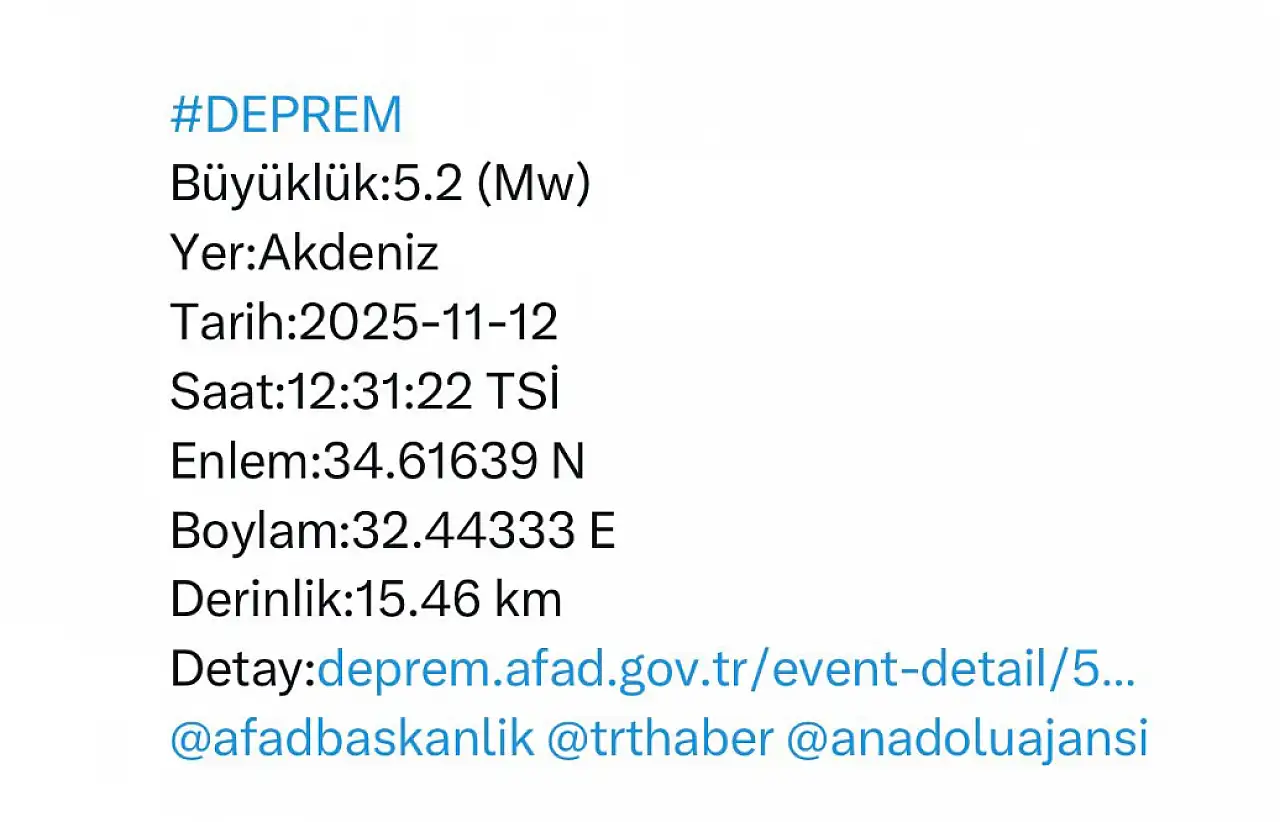Afet ve Acil Durum Yönetimi Başkanlığı'ndan edinilen bilgilere göre, Akdeniz açıklarında 5.2 şiddetinde bir depremin meydana geldiği kaydedildi.