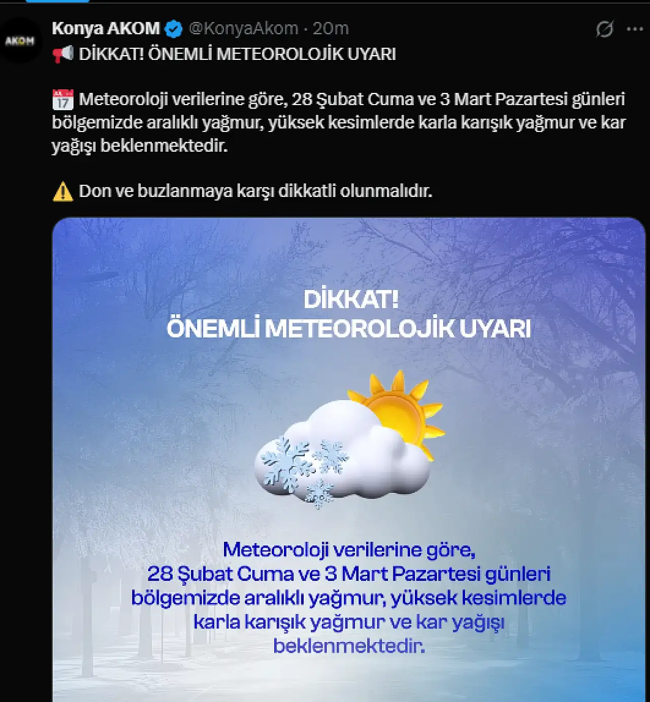 olumsuzluklara karşı tedbirli olmasını isteyen Konya AKOM, “Meteoroloji verilerine göre, 28 Şubat Cuma ve 3 Mart Pazartesi günleri bölgemizde aralıklı yağmur, yüksek kesimlerde karla karışık yağmur ve kar yağışı beklenmektedir.” dedi.