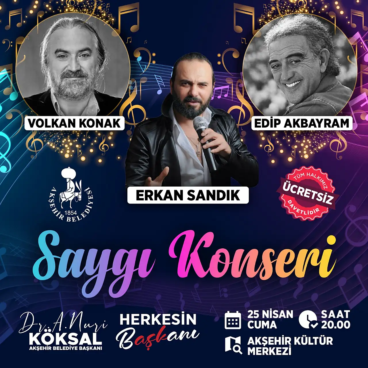 Akşehir Belediyesi tarafından, yakın zamanda hayatını kaybeden sanat dünyasının iki değerli ismi Volkan Konak ve Edip Akbayram'ın ölümsüz eserlerini, müziğe kattıkları değerleri hatırlamak ve kendilerini saygıyla anmak amacıyla 25 Nisan 2025 Cuma günü saat 20.00'de Akşehir Kültür Merkezinde 'Saygı Konseri' düzenlenecektir.