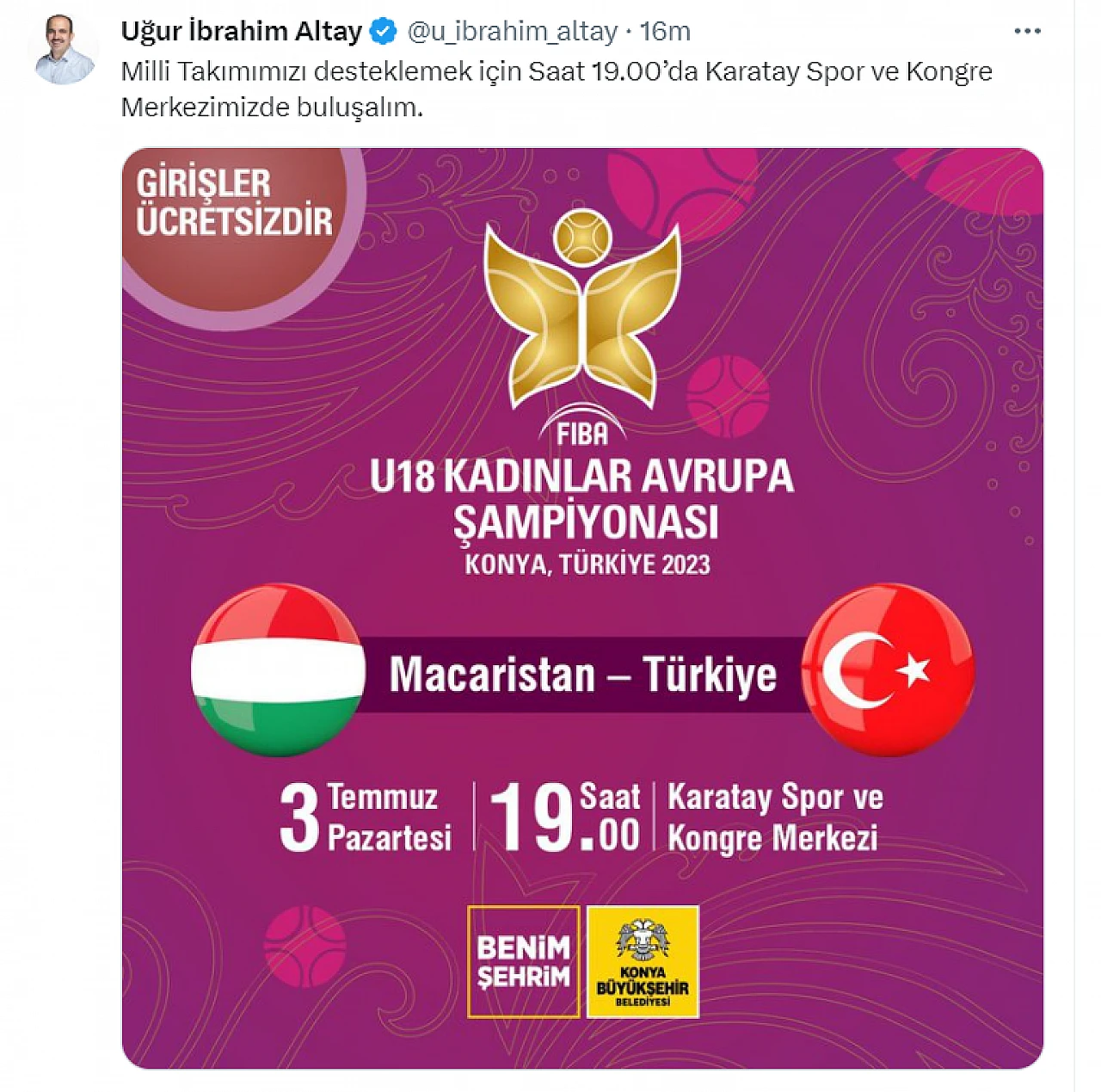 Altay, yayımladı mesajda şu ifadelere yer verdi: “Milli Takımımızı desteklemek için Saat 19.00’da Karatay Spor ve Kongre Merkezimizde buluşalım”