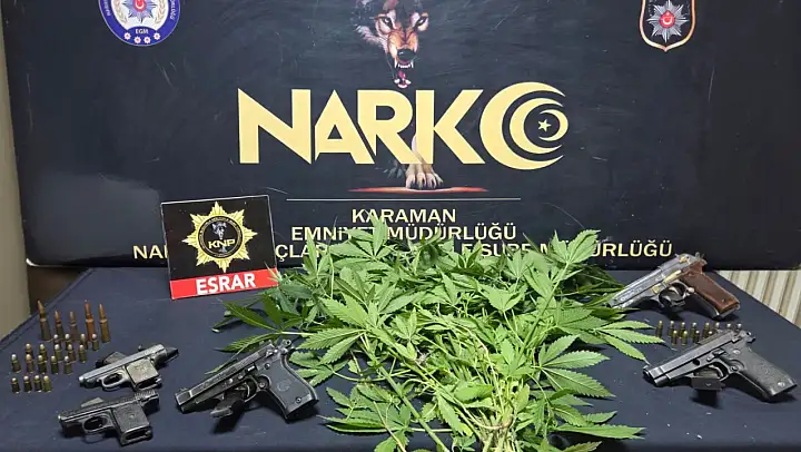Karamanda gerçekleştirilen düzenli asayiş uygulamalarında uyuşturucu ve ruhsatsız silahlar ele geçirildi. Çeşitli suçlardan aranan 10 şahıs ise tutuklandı.