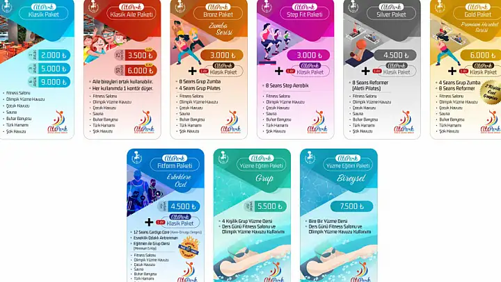 AtaPark'ta kadınlara, erkeklere, çocuklara ve ailelere hitap eden toplam 9 farklı özel paket hazırlandı. Gold, Silver, Bronz, Fitform, Step Fit, Yüzme Eğitim (bireysel ve grup), Klasik Aile ve Klasik Paket seçenekleriyle her yaş ve ihtiyaca yönelik alternatifler sunuluyor.