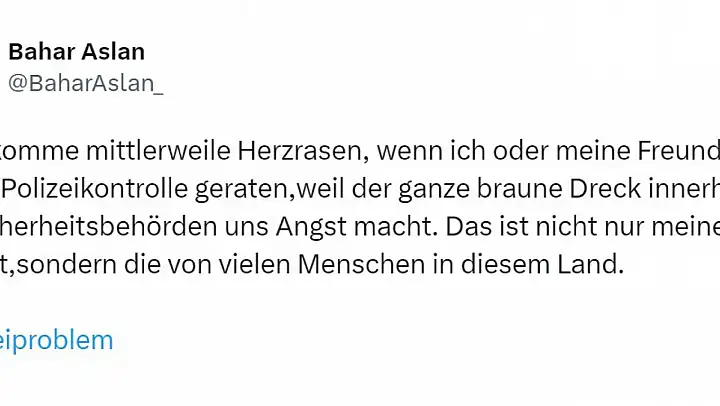 Almanya'da Polis Yüksekokulu'nda öğretim görevlisi Bahar Aslan, sosyal medyada yaptığı 'emniyet içindeki ırkçı tutumu' dile getiren paylaşımı nedeniyle görevden alındı. Yargı sürecinin takipçisi olacaklarını ifade eden Kuzey-Ren Vestfalya (KRV) Türk Toplumu Başkanı Serhat Ulusoy, Alman yetkililerine sürecin demokratik ve tarafsız şekilde değerlendirilmesi gerektiğini söyledi.