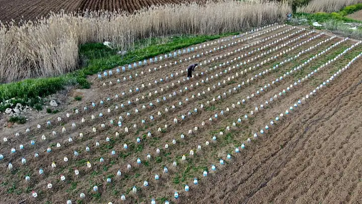 Sivas'ın Şarkışla ilçesinde ektiği fideleri soğuk ve dolu yağışından korumak isteyen çiftçi, her fidenin üzerine plastik pet şişe kapattı
