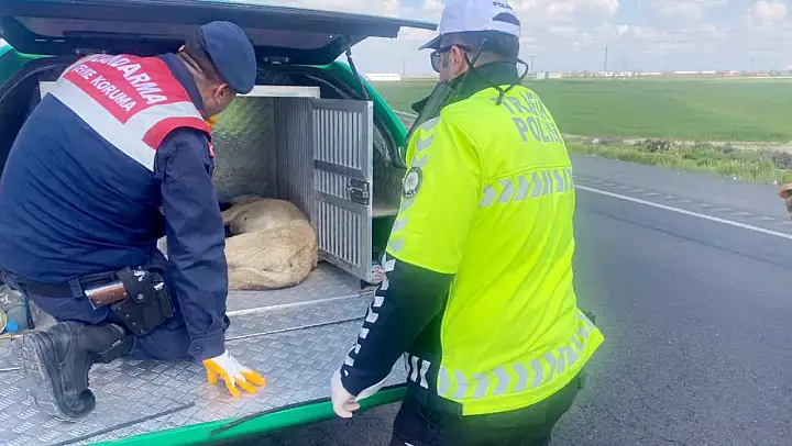 Aksaray'da arazide devriye atan İl Jandarma Komutanlığı Çevre, Doğa ve Hayvanları Koruma Timi ekipleri Aksaray - Konya Karayolu üzerindeki arazide bir köpeğin hareketsiz yattığını fark etti.