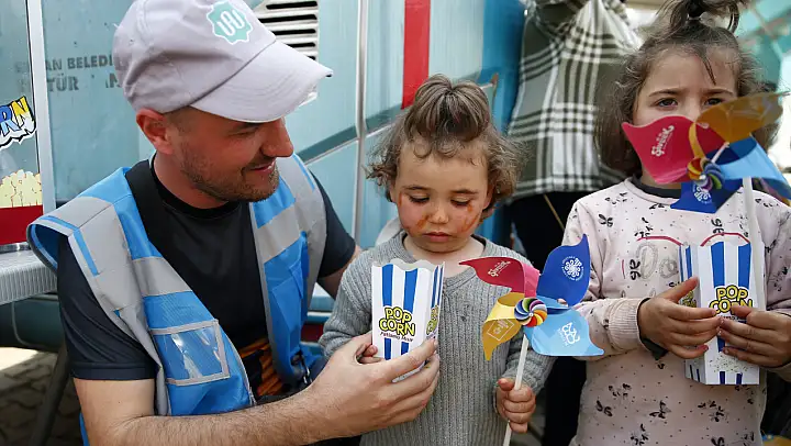 Hatay'ın Kırıkhan ilçesine gelen gezici ekip, pamuk şeker, patlamış mısır, boyama ve hikaye kitabı gibi hediyeler dağıttıkları çocukların hafızasından depremin izlerini silmeye çalışıyor.