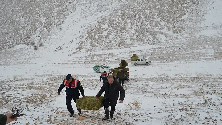 Yabani hayvanlar için araziye buğday ve ot balyaları bırakan ekiplerin görüntüleri yürek ısıttı.