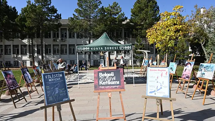 Konya'da İnsani Yardım Vakfı (İHH) Derneği Seydişehir Temsilciliği'nce Hükümet Konağı önünde açılan fotoğraf sergisinde, İsrail'in Gazze'deki saldırıları ve bölgede çekilen kareler yer alıyor.