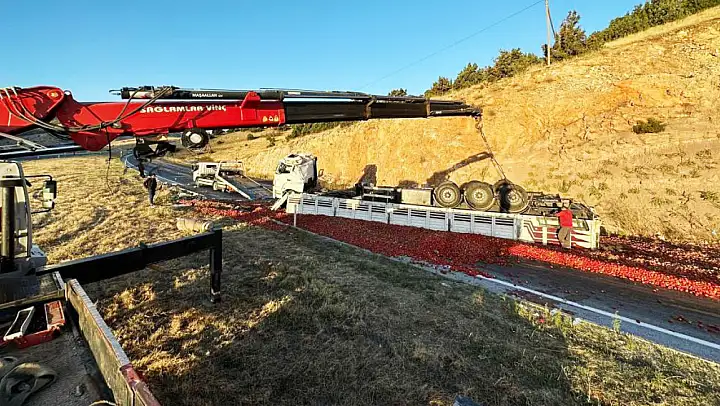 Kaza sonrası karayolunda trafik bir süreliğine tek şeritten sağlanırken, tır sürücüsünün Konya'dan aldığı domatesleri salça yapılmak üzere Eskişehir'e götürdüğü belirtildi.