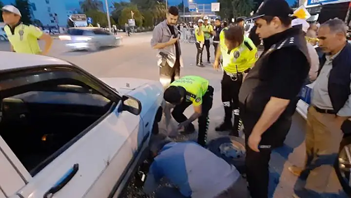 Adıyaman'da, lastiği patlayan bir otomobil polis ekiplerince önce durduruldu sonra lastiği değiştirildi.