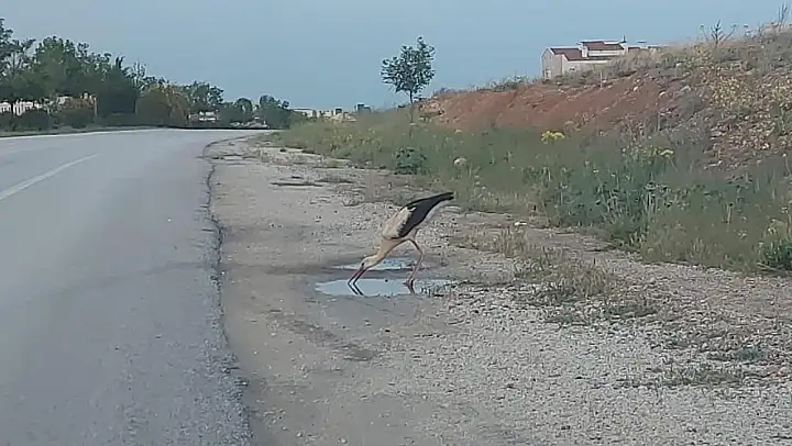 Sürüsünden kopan leylek yol kenarındaki su birikintisinden susuzluğunu giderdi