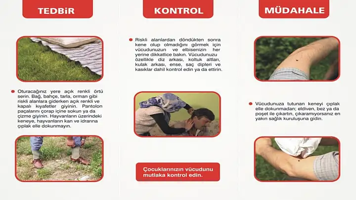 Sağlık Müdürlükleri bahar ayları ile birlikte ortaya çıkan kene tehlikesine karşı camii, okul ve benzeri yerlere bilgilendirici afiş-broşürler dağıtırken, hastalığa yakalanan kişilerin kan, vücut sıvıları ve çıkartıları ile hastalık bulaşabildiğini hatırlatılarak, “Hasta ile temas eden kişiler gerekli korunma önlemlerini almalıdır. Hastalığa sebep olan mikrobun taşıyıcısı, saklayıcısı ve bulaştırıcısı olan keneler uçmayan, zıplamayan, yerden yürüyerek vücuda tırmanan eklem bacaklı hayvanlardır. Vücuda tutunan veya hayvanların üzerinde bulunan keneler kesinlikle çıplak el ile öldürülmemeli ve patlatılmamalıdır. Keneler üzerine sigara basmak, kolonya, gaz yağı gibi maddeler dökmek kenenin kasılmasına sebep olarak vücut içeriğini kan emdiği kişiye aktarmasına sebep olacağı için yapılmamalıdır.” dediler.