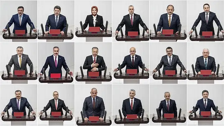 Cumhurbaşkanı Yardımcısı Cevdet Yılmaz, Adalet Bakanı Yılmaz Tunç, Aile ve Sosyal Hizmetler Bakanı Mahinur Özdemir Göktaş, Çalışma ve Sosyal Güvenlik Bakanı Vedat Işıkhan, Çevre, Şehircilik ve İklim Değişikliği Bakanı Mehmet Özhaseki, Dışişleri Bakanı Hakan Fidan, Enerji ve Tabii Kaynaklar Bakanı Alparslan Bayraktar, Gençlik ve Spor Bakanı Osman Aşkın Bak, Hazine ve Maliye Bakanı Mehmet Şimşek, İçişleri Bakanı Ali Yerlikaya, Kültür ve Turizm Bakanı Mehmet Nuri Ersoy, Milli Eğitim Bakanı Yusuf Tekin, Milli Savunma Bakanı Yaşar Güler, Sağlık Bakanı Fahrettin Koca, Sanayi ve Teknoloji Bakanı Mehmet Fatih Kacır, Tarım ve Orman Bakanı İbrahim Yumaklı, Ticaret Bakanı Ömer Bolat, Ulaştırma ve Altyapı Bakanı Abdulkadir Uraloğlu TBMM Genel Kurulunda ant içti.