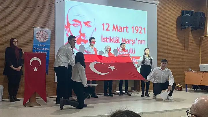 Kurtuluş Savaşı'nın Amacını ve Ruhunu, Milletimizin Bağımsızlık İstek ve azmini dile getiren İstiklal Marşı'nın Kabulünün 102. yıl dönümü ve Mehmet Akif Ersoy'u Anma Günü nedeniyle Yunak Cemal Karacan Anadolu Lisesi öğretmen ve öğrencilerinin hazırladıkları ilçe programı, Orhan Erdem İmam Hatip Ortaokulu Konferans Salonu'nda gerçekleştirildi.