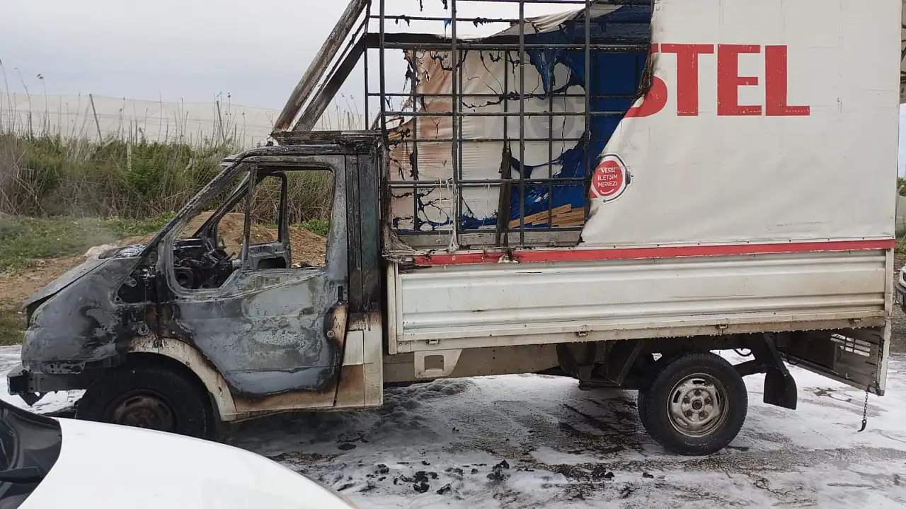 Ticari araç yanarak kullanılamaz hale geldi, ekiplerin çalışmaları devam ediyor.