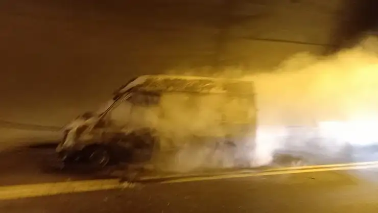Artvin'de Borçka Karayolu Seyitler 1 Tünelinde seyir halindeki hafif ticari araç alev alarak yandı.