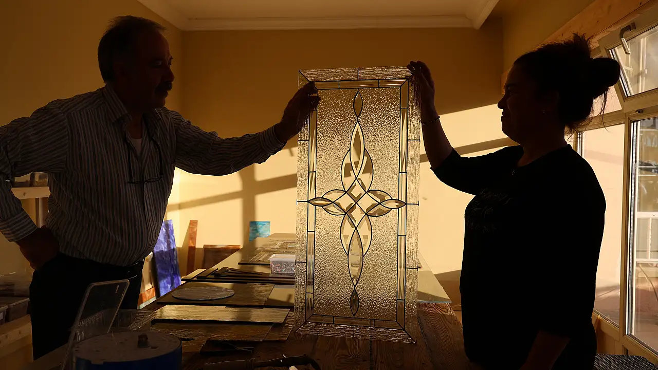 Kırşehir'de 'Usta Eller Atölyesi'ni işleten Selda ve Hikmet Dönmez çifti, yaklaşık 30 yıldır hurda camları kesme, oyma ve parlatma işlemlerinden geçirerek mimari projeler için özel dekor ürünlerine dönüştürüyor.
