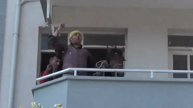 İzmir'in Bergama ilçesinde, düğünlerde cirit oynatılması ve atlıların hediyelerini düğün sahibinin evinde alması geleneği sırasında bir kişi, atıyla apartmanın dairesine çıktı, herkes şaşkınlığını gizleyemedi. Kişinin atla daireye çıktığı ve balkondan poz verdiği anlarda ortaya ilginç görüntüler çıktı.