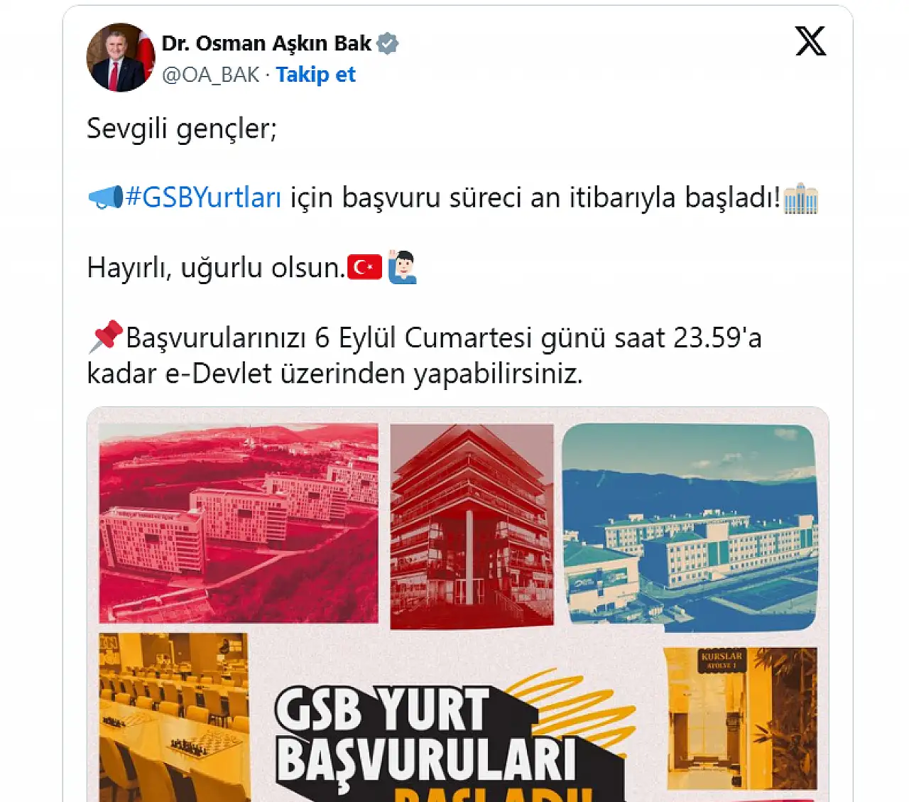 Gençlik ve Spor Bakanı Osman Aşkın Bak, Gençlik ve Spor Bakanlığı bünyesinde olan KYK yurt başvurularının başladığını duyurdu.
