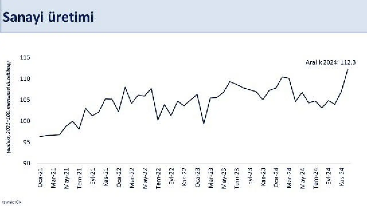 Bakan Şimşek, sosyal medya hesabından yaptığı paylaşımda, "2024 yılında dış talepteki zayıf seyre ve dezenflasyonun kısa vadeli etkilerine rağmen ekonomimiz üretmeye, istihdam oluşturmaya devam etti. Sanayi üretiminde geçen yılın ikinci ve üçüncü çeyreğindeki daralmanın ardından son çeyrekte yüzde 3,4’lük kuvvetli bir artış gerçekleşti.