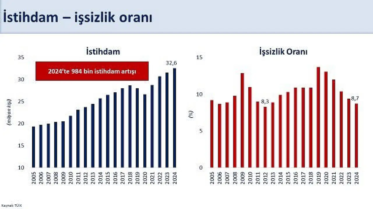Hazine ve Maliye Bakanı Mehmet Şimşek, '2024'te istihdam yıllık 984 bin kişi artarken işsizlik oranı 0,7 puan azalışla 2012 yılından sonraki en düşük seviyesi olan yüzde 8,7'ye geriledi' dedi.