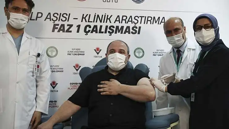 Sanayi ve Teknoloji Bakanı Varank, koronavirüse karşı geliştirilen insan klinik denemelerinin Faz-1 aşamasındaki virüs benzeri parçacıklara dayalı (VLP) aşısının ilk dozunu yaptırdı.