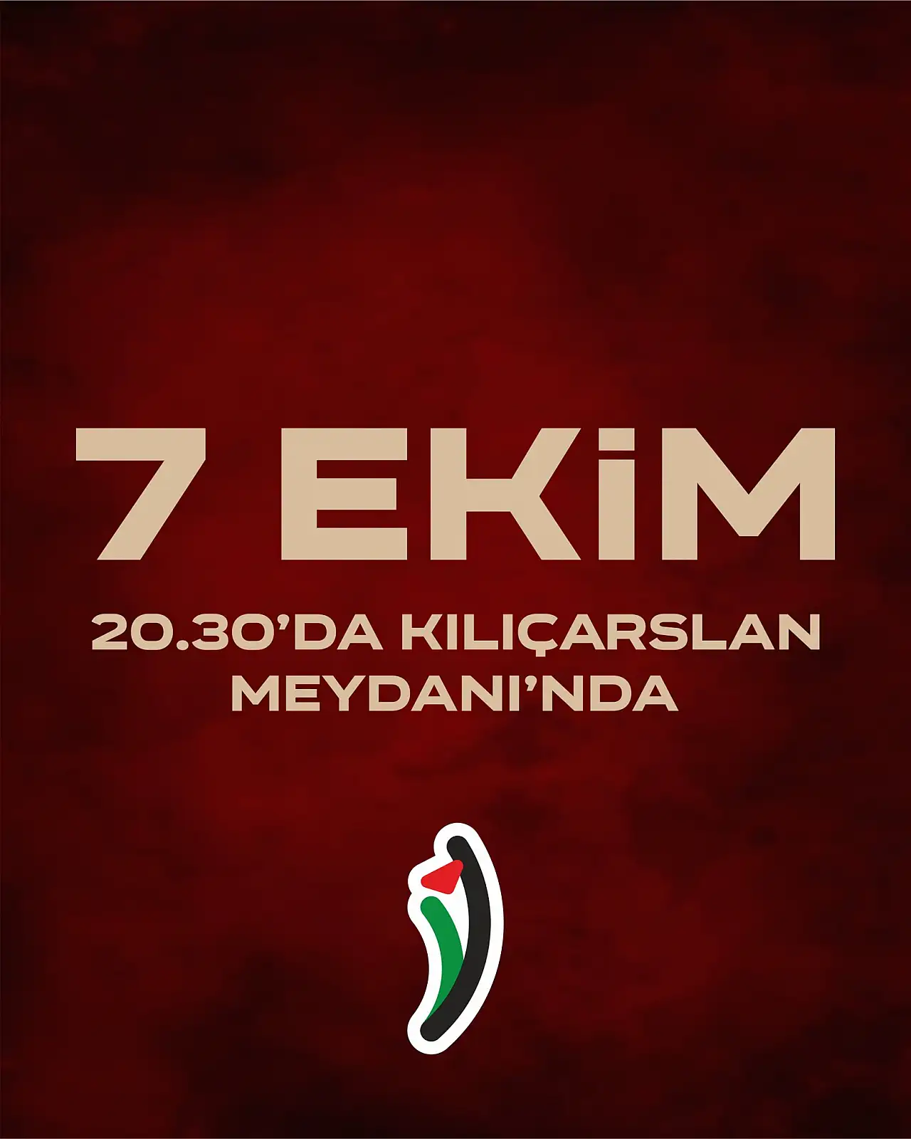 Başkan Altay 7 Ekim saat 20.30'da tüm vatandaşları Kılınçarslan Meyda'nına davet etti. Duyurusunu yaptığı afişte Filistin bayrağını temsil eden bir simge bulunuyor. Ancak etkinliğin detayları belli değil ve gizemini koruyor..