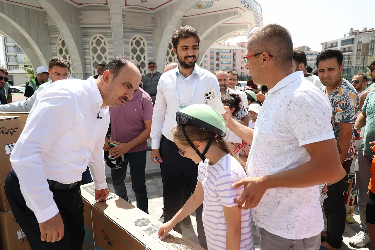 Konya Büyükşehir Belediye Başkanı Uğur İbrahim Altay, “Güle Oynaya Camiye Gel” projesi çerçevesinde yaz tatilinde bisiklet almaya hak kazanan çocuklara bisikletlerini hediye etti.