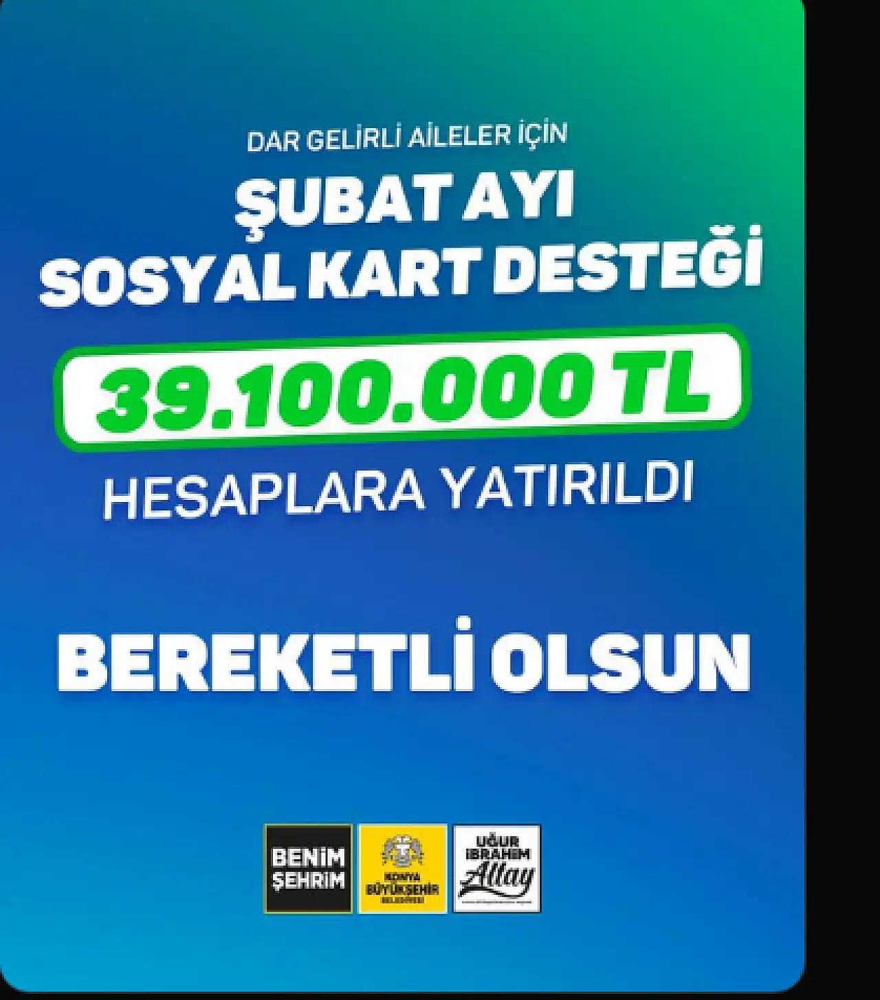 Konya Büyükşehir Belediye Başkanı Uğur İbrahim Altay'ın aktardığı bilgilere göre, dar gelirli aileler için Şubat ayı Sosyal Kart desteği kapsamında 39 milyon 100 bin TL'yi hesaplara yatırıldığı aktarıldı.