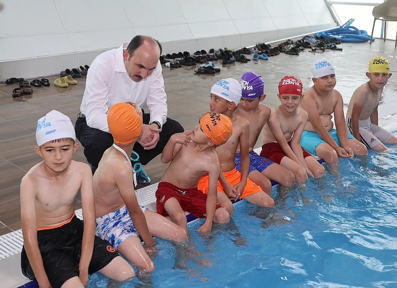 Konya Büyükşehir Belediye Başkanı Uğur İbrahim Altay, 'Yüzme Bilmeyen Kalmasın' projesi kapsamında yaz tatilinde yüzme eğitimi alan öğrencilerle buluştu.