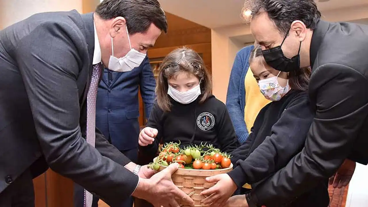 Özel öğrenciler, ziyarete elleri boş gelmedi. Karatay Belediyesi tarafından desteklenen sera projesinde kendi elleriyle yetiştirdikleri ürünlerle birlikte ziyarete gelen öğrenciler, bir süre Başkan Hasan Kılca ile görüştükten sonra ürünleri Hasan Kılca’ya hediye ederek destekleri için teşekkürlerini ilettiler.