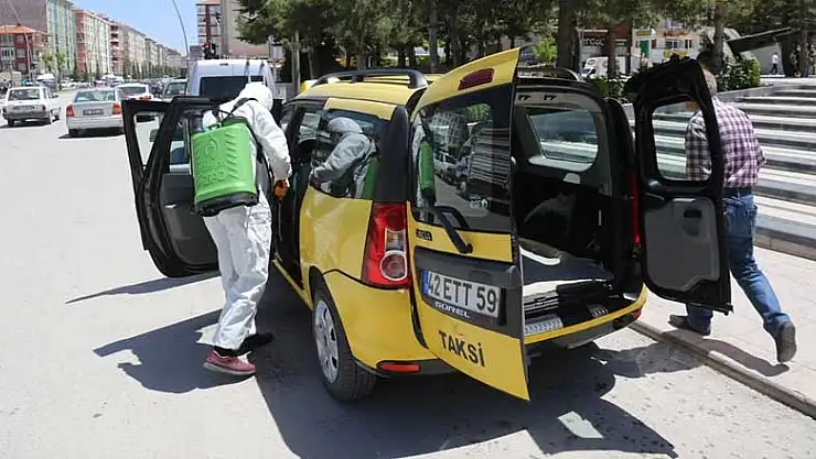 Konya Ereğli İlçe Belediyesi koronavirüs (Covid-19) tedbirleri kapsamında ticari taksileri dezenfekte etmeyi sürdürüyor.