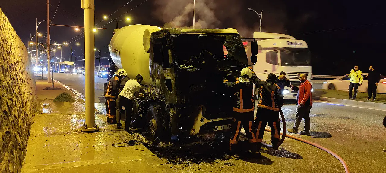 Malatya-Elazığ karayolunda seyir halindeyken alevlere teslim olan bir beton mikseri, itfaiye ekiplerinin hızlı müdahalesiyle söndürüldü.
