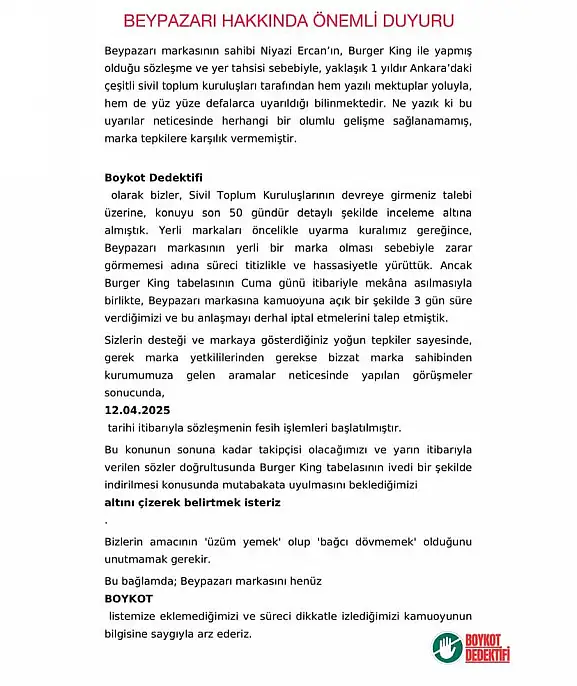 Boykot çağrılarıyla tanınan Boykot Dedektifi platformu, Beypazarı'nın Burger King ile olan sözleşme ve yer tahsisi nedeniyle yaklaşık bir yıldır sivil toplum kuruluşları tarafından uyarıldığını, ancak bu uyarıların uzun süre karşılıksız kaldığını açıkladı.