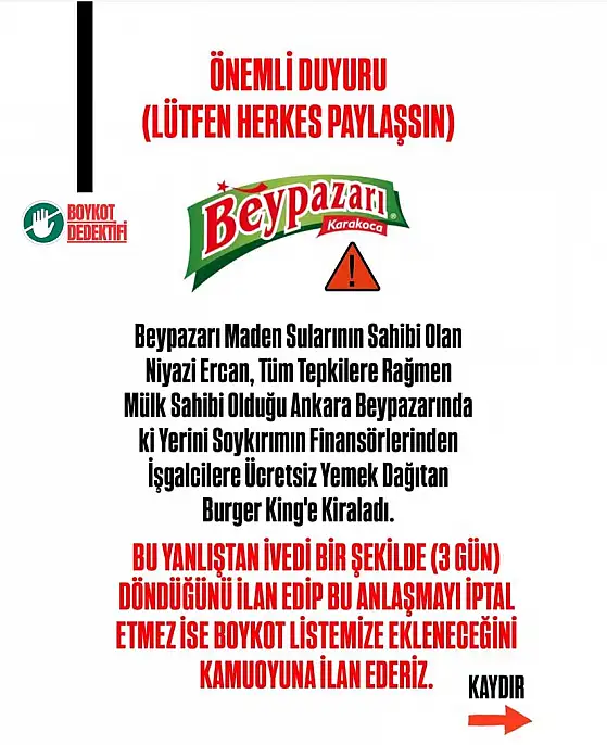 Boykot Dedektifi, bu karardan geri dönülmemesi halinde Beypazarı Maden Suları’nın da boykot listesine ekleneceğini duyurdu.