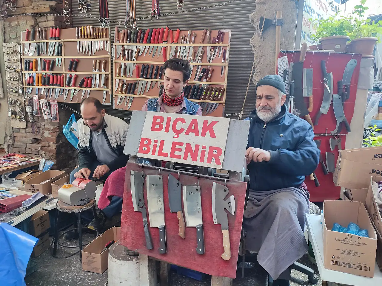 Kör bıçak her zaman tehlikedir ama keskin bıçak ustanın ellerinde güzel bir sanat meydana çıkarır. Bir aydan beri burada bıçak biliyoruz ama vatandaşlarımızın çoğu son günlere bırakıyor. Hem kendileri sıkışıyor hem de biz çok sıkışıyoruz, ellerimiz sıkışıyor. Çoğu müşteriye ertesi güne sıra veriyoruz. Kimiyle anlaşıyoruz, kimiyle anlaşamıyoruz. Vatandaşlarımız bir ay kala gelip getirmeye başlasınlar. Kendileri için de iyi olur. Bıçak bileme ücreti 30 lira. Satırlar 60 liradan başlıyor. Ağzının bozukluğuna göre satırı 70-80 lira olarak devam edebiliyor. Et makinesi takımları en büyüğü 120 lira, küçük orta boy 100 lira. Bıçak bileme 30 lira genelde" diye konuştu.