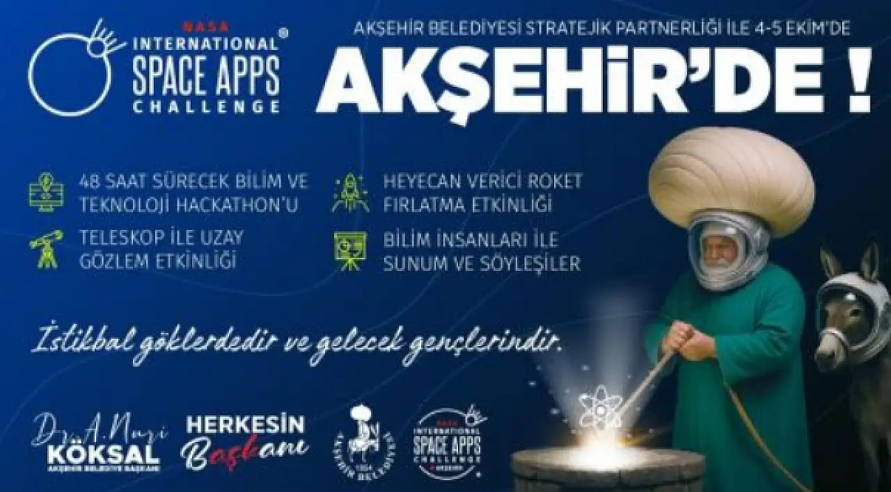 3-5 Ekim 2025 tarihlerinde Konya'nın Akşehir ilçesinde dünyanın en büyük bilim ve teknoloji hackathonlarından biri olan 'NASA International Space Apps Challenge' düzenlenecek.