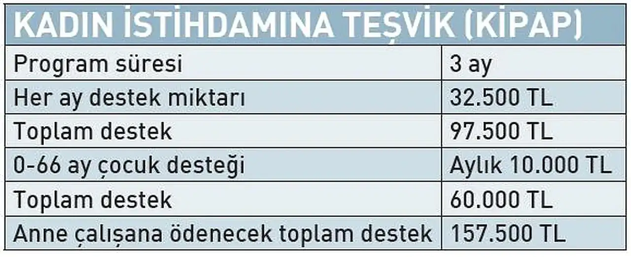 Kadın istihdamını teşvik edici birçok destek de uygulanmaya devam ediyor. İlave istihdama yapılan destekler eğer işe alınan kadın ise daha da artıyor, süresi uzuyor. Bu desteklerden birisi de geçtiğimiz yıl devreye alınan KİPAP. Yani Kadın İstihdamı İçin Pozitif Ayrımcılık Projesi, işe kadın ve anne alan işyerlerine önemli destekler sunuyor. Bu desteklerde özellikle anne olanlara yapılan ödemeler artırıldı. KİPAP projesi çalışan kadınlar ve anneler için geliştirildi. Bu yüzden proje tamamen kadınlara yönelik uygulanıyor.