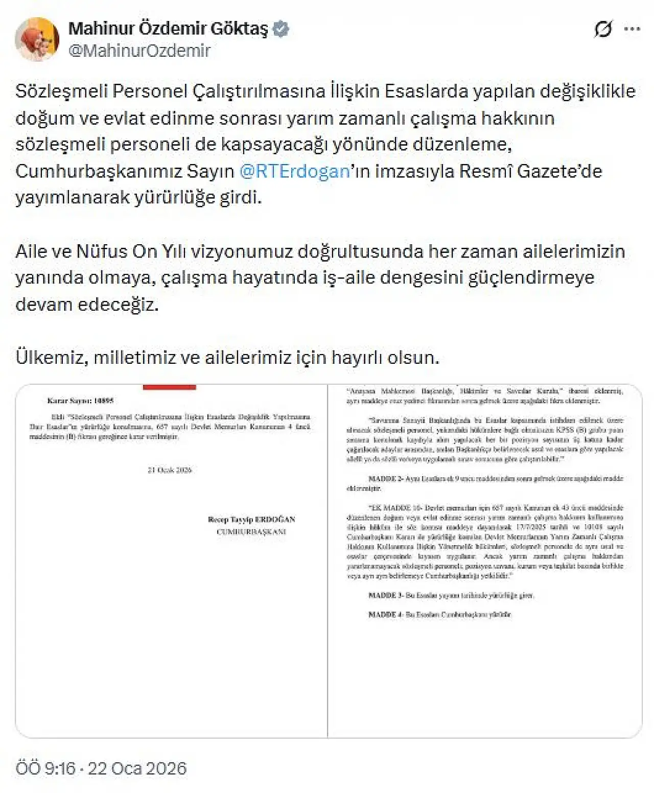 Aile ve Sosyal Hizmetler Bakanı Mahinur Özdemir Göktaş, düzenlemeye ilişkin sosyal medya hesabından yaptığı paylaşımda, “Sözleşmeli Personel Çalıştırılmasına İlişkin Esaslar'da yapılan değişiklikle doğum ve evlat edinme sonrası yarım zamanlı çalışma hakkının sözleşmeli personeli de kapsayacağı yönünde düzenleme, Cumhurbaşkanımız Sayın Recep Tayyip Erdoğan'ın imzasıyla Resmi Gazete'de yayımlanarak yürürlüğe girdi. 'Aile ve Nüfus 10 Yılı' vizyonumuz doğrultusunda her zaman ailelerimizin yanında olmaya, çalışma hayatında iş-aile dengesini güçlendirmeye devam edeceğiz. Ülkemiz, milletimiz ve ailelerimiz için hayırlı olsun” ifadelerini kullandı.