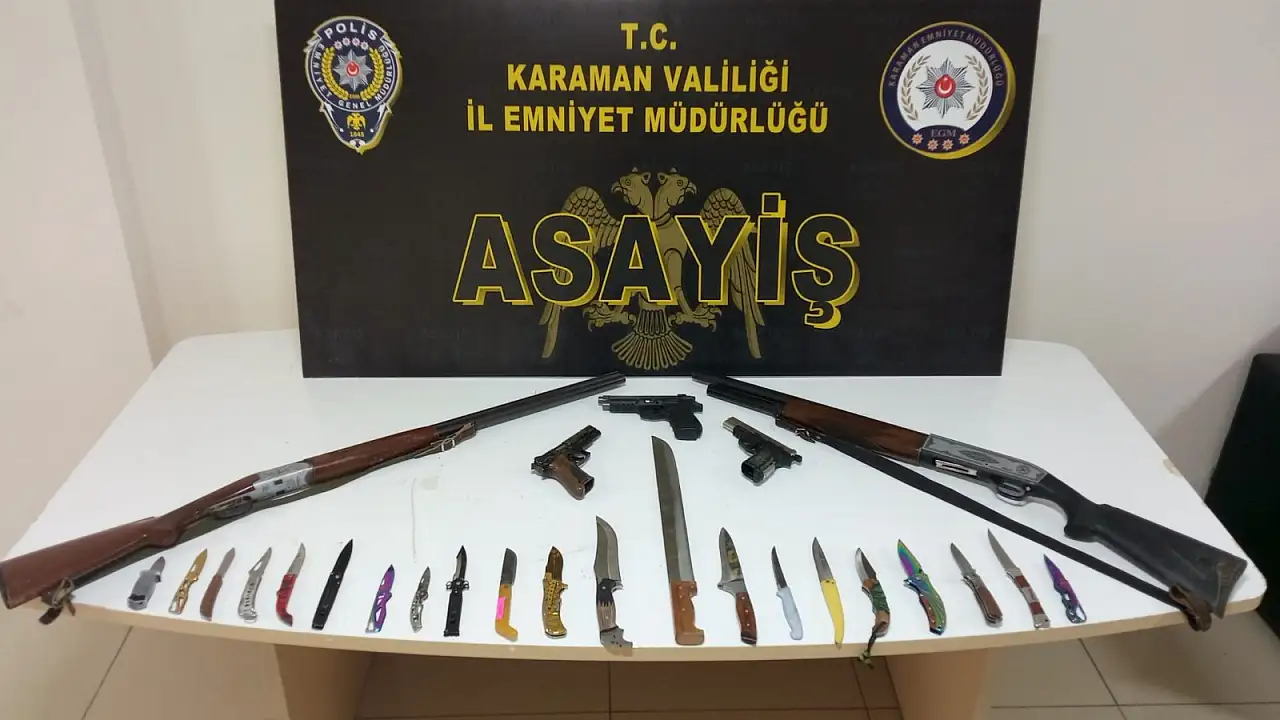 Ekipler, 1 ruhsatsız tabanca, 2 ruhsatsız tüfek, 21 kesici-delici alet, çeşitli miktarlarda uyuşturucu madde ele geçirdi.