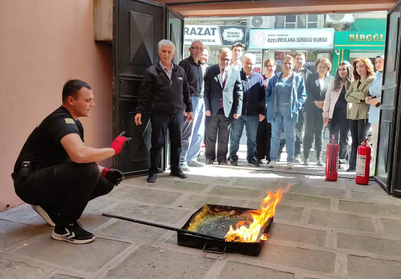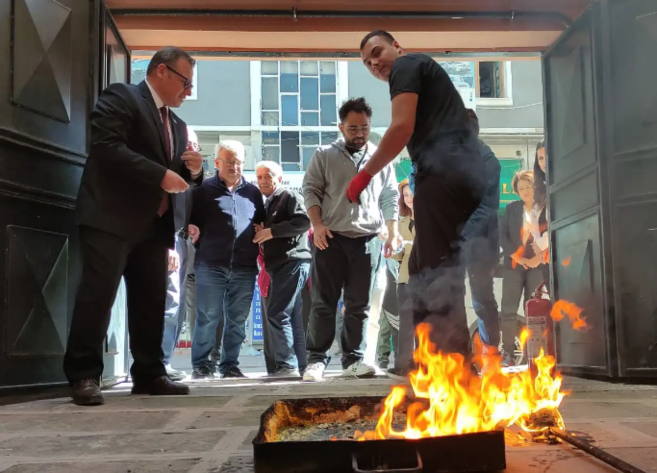Eğitim oturumunun ardından kurum otoparkında uygulamalı yangın tatbikatı gerçekleştirildi. Tatbikatta, mazot kullanılarak kontrollü biçimde yakılan ateşe yangın söndürme tüpüyle müdahale edilmesi örneklendi. Personelin aktif katılım gösterdiği uygulamada, yangına doğru ve hızlı şekilde müdahale etmenin önemi vurgulandı.