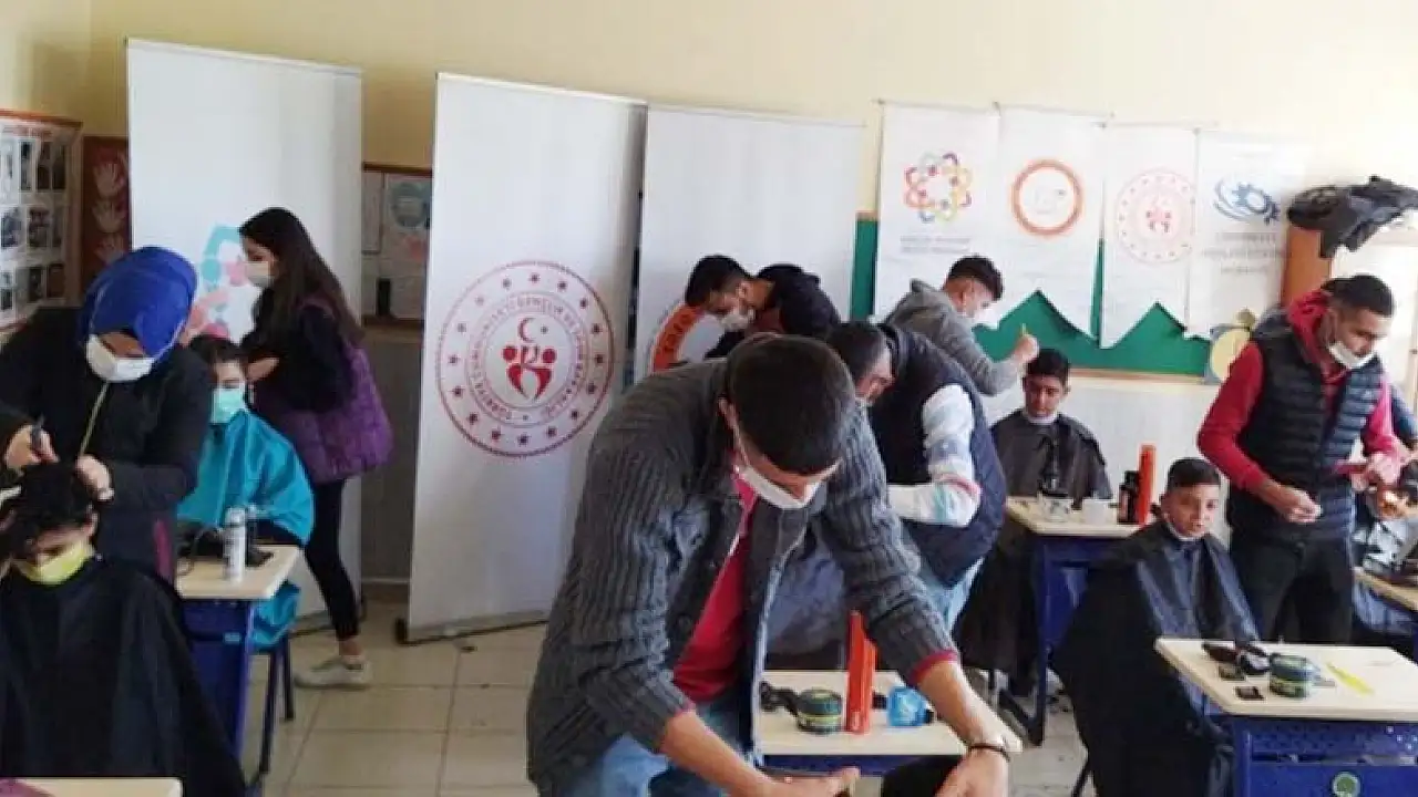 Cihanbeyli ilçesi, Mesleki Eğitim Merkezi tarafından başlatılan proje kapsamında ilçeye uzak mahallelerdeki kız ve erkek öğrencilere kuaför hizmeti sunuluyor.