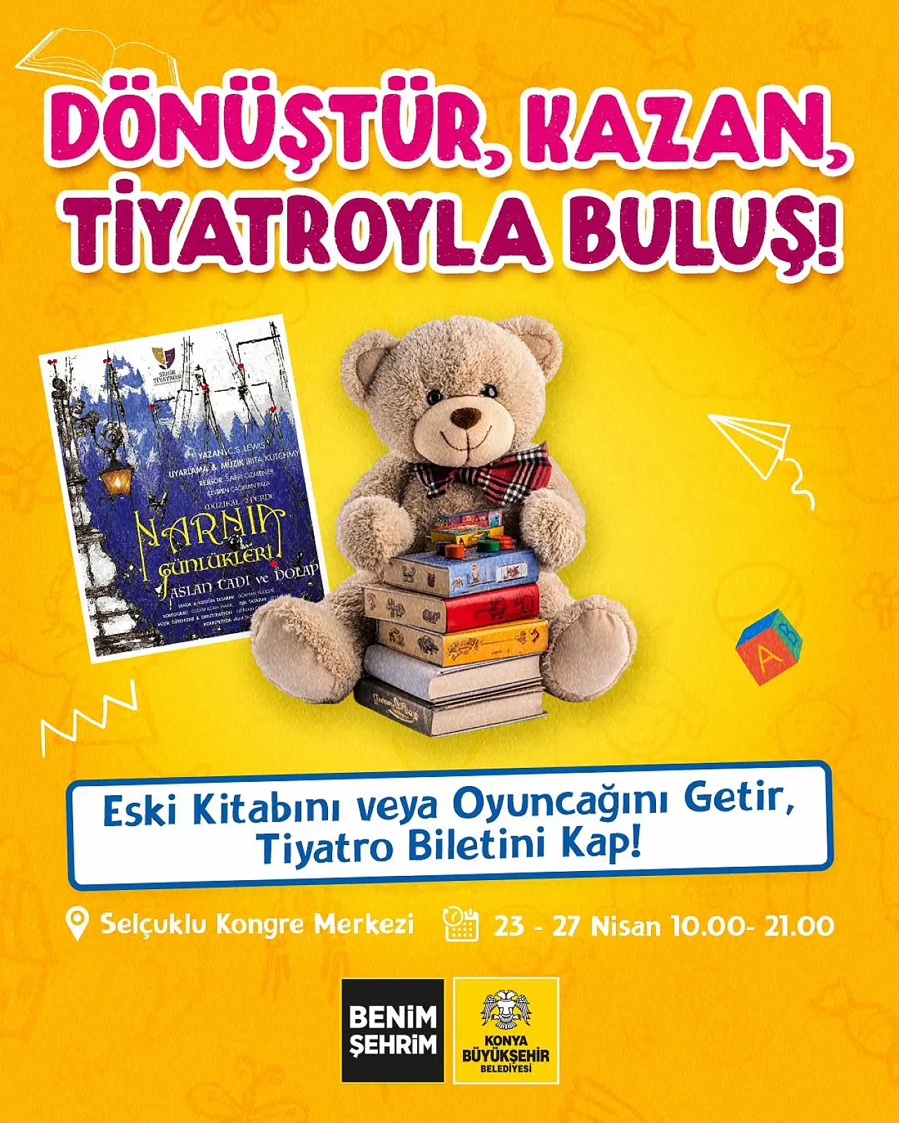 Konya Büyükşehir Belediyesi tarafından 23 Nisan - 27 Nisan tarihleri arasında Selçuklu Kongre Merkezi’nde düzenlenecek “Çocuk Kitap Günleri” kapsamında “Dönüştür, Kazan, Tiyatroyla Buluş!” kampanyası da hayata geçirilecek. Çocuklar kullanmadıkları oyuncakları veya kitapları getirerek Sıfır Atık Projesi’ne destek olurken; Konya Şehir Tiyatrosu’nun “Narnia Günlükleri” isimli çocuk oyununa tiyatro bileti kazanacak.